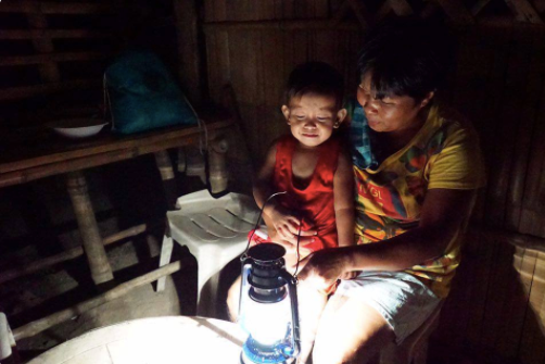 Семья, сидящая у преобразованной в солнце керосиновой лампы от Liter of Light.